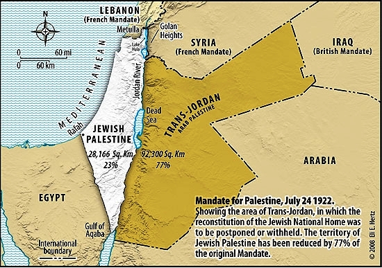 But they proved to be temporary only in relation to Palestine – because three months later the provisions of Article 25 of the Mandate for Palestine enabled Great Britain to restrict the reconstitution of the Jewish National Home to within 23 per cent of the tiny area of land originally set aside to achieve that objective at San Remo – with the remaining 77 per cent of Mandatory Palestine eventually becoming an independent Palestinian Arab state in 1946 – that is today called Jordan.