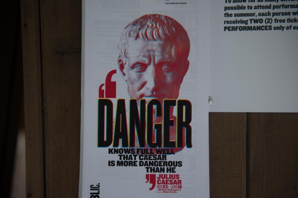 A sign promoting Julius Caesar is displayed on opening night of Shakespeare in the Park’s production of Julius Caesar at Central Park’s Delacorte Theater on June 12, 2017 in New York. A New York production of Shakespeare’s ‘Julius Caesar’ drawing parallels between the assassinated Roman ruler and Donald Trump was in the eye of a growing storm, abandoned by corporate sponsors and sparking debate about freedom of expression. / AFP PHOTO / Bryan R. Smith (Photo credit should read BRYAN R. SMITH/AFP/Getty Images)
